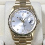 36mm Rolex Day-Date model 18238 in 18ct yellow gold with sparkling silver / diamond dot dial on President bracelet. In very pleasing condition, this circa 1990 model * comes with correct Day-Date booklet, modern Rolex boxes, our own warranty card and a certificate from the ALR Watch Register confirming that we checked it with them. The 18238 with its 3155 calibre movement was the first model to feature the “double quick-set” feature for easy, independent alteration of the Day and Date. * We note that the date-code on the clasp indicates that this part is from around 1980 while the “53” end-links would more commonly be found on bracelets for 1803 model Day-Dates, so we believe the bracelet has been swapped from an earlier watch and is possibly restored, which is reflected in the price. The NEW equivalent is now £36,900 !