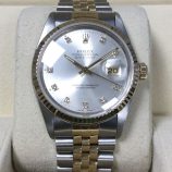 36mm bicolour Rolex Datejust model 16233 on Jubilee 62523 bracelet with smart grey / diamond dot dial in the later style with larger settings. Has Rolex boxes, Datejust booklet and UK papers from David Morris International at Selfridges dated November 1998. In very pleasing condition but we do note that the glass is a generic replacement, not by Rolex. The NEW equivalent is now £12,950 ! Available from Miltons of Chester, under the famous clock.