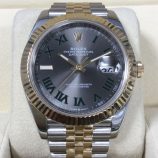 Current model ! Bicolour Rolex Datejust 41 model 126333 on Jubilee 62613 / articulated clasp bracelet with desirable slate-grey “Wimbledon” dial. This is a lovely example of the revised 41mm model that was introduced in the last ten years, coming with both boxes, Datejust booklet, our own warranty card and a certificate from the ALR Watch Register confirming that we checked it with them. It is in excellent condition with only superficial wear to the edge of the glass. We first sold this watch some years ago with a silver / index baton dial, but before trading it back in with us the owner had this genuine Rolex “Wimbledon” dial fitted by a third party watchmaker. The NEW RRP is now £13,650 ! RRP0125-795875