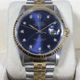 SOLD36mm bicolour Rolex Datejust model 16233 on Jubilee 62523 bracelet with very desirable BLUE / diamond dot dial. This early 1990s watch is in lovely condition with original Rolex 16233 boxes, a Datejust booklet and undated international Rolex papers. The NEW equivalent is now £13,950 ! RRP0125
