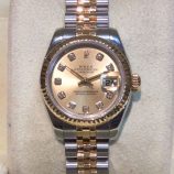 £3,699 Stock number: 22-35-002Bicolour Datejust model 79173 with champagne / diamond dial in the later style with larger settings, on Jubilee 62523 bracelet. In very nice condition with Rolex boxes, Datejust booklet, UK papers from Goldsmiths in Leicester dated March 2003 and a Rolex UK service slip from September 2013. Please note that the papers and service slip have been laminated, having been previously affected by damp. The NEW equivalent is now £7,100! Available from Miltons of Chester, under the famous clock.