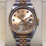 £3,599 Stock number: 12-35-024Bicolour Datejust model 69173 on Jubilee 62523 bracelet with champagne / diamond dial in the later style with larger settings. This 1995 model is in very nice condition and comes with later Rolex boxes, Oyster booklet, red swing-tag and our own warranty card. The NEW equivalent is now £7,100!