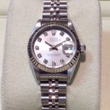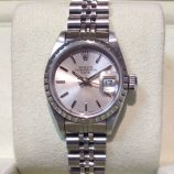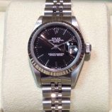 £2,099 Stock number: 12-27-024Lady’s Oyster Perpetual DATE model 69174 in steel and white metal, with black / baton dial on Jubilee 62510 bracelet. Having had a movement service in July 2014 this watch is in very nice order with only a little wear to the bracelet. It comes with a later Rolex box-set, Oyster booklet, red swing-tag and our own warranty card. The NEW equivalent is now £4,800 !