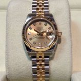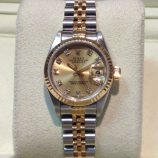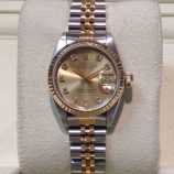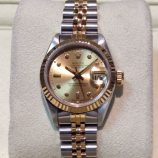 £3,599 Stock number: 80-08-006Lady's 26mm bicolour Rolex Datejust model 69173 on Jubilee 62523 bracelet with classic champagne / diamond dot dial. This circa 1990 watch has Rolex boxes, later Oyster booklet and our own warranty card. Under very close inspection the dial shows minor signs of its age, almost impossible to see with the naked eye. The nearest NEW equivalent model (279173) is now £8,600!