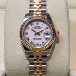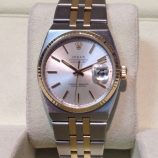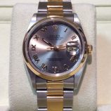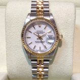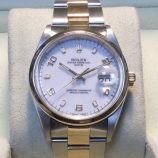 £4,499 Stock number: 52-47-022Bicolour Rolex Oyster Perpetual DATE model 15203 from approx 1999, on Oyster 78353 bracelet with white / 2-4-6-8-10 dial. In lovely condition with Rolex boxes, Your Oyster booklet, some oriental paperwork with corresponding case numbers, our own warranty card and a certificate from the ALR Watch Register confirming that we checked it with them. Rolex no longer make a bicolour 34mm model, but the nearest new equivalent (even in the smaller 31mm size) is now £7,750!