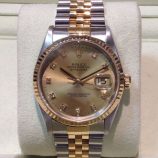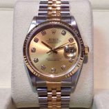 £3,599 Stock number: 12-22-013Bicolour Datejust model 16233 on Jubilee 62523 bracelet with champagne / diamond dot dial. This 2001 model is in excellent condition but we comment that the dial is a version we would expect to have seen supplied no later than perhaps the mid-1990s, so has probably been fitted to this watch later. It comes with a later Rolex box, Datejust booklet, red swing-tag and our own warranty card. The NEW equivalent is now £8,600!