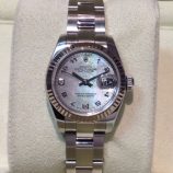 £4,399 Stock number: 12-70-013Stainless steel and white metal Rolex Datejust model 179174 on Oyster 72130 bracelet with most unusual Mother-of-Pearl / grey “gold-dust” dial featuring two diamonds, at 6 and 9 o'clock. This pretty watch is in lovely condition and comes with original boxes, Datejust booklet, green swing-tag and UK warranty card dated February 2008. This variant was produced for a limited period; its last, listed NEW RRP was £6,250…but prices for most models rose approx 10% after that!