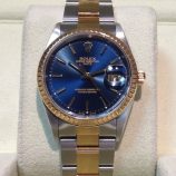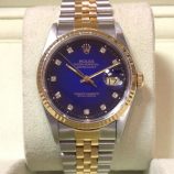 £3,699 Stock number: 12-29-013Bicolour Datejust model 16233 from approx 1993 on Jubilee 62523 bracelet with popular BLUE / diamond dot dial. Having been serviced in Summer 2014 this watch is in very good condition with a later Rolex box-set, Oyster booklet, red swing-tag and our own warranty card. The NEW equivalent is now £8,600!