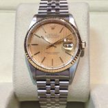 £2,399 Stock number: 12-30-006Bicolour Datejust model 16233 now fitted on an all-steel Jubilee 62510 bracelet! This watch would originally have been sold on a bicolour Jubilee or Oyster bracelet, but has recently had this replaced with the steel Rolex Jubilee pictured. Usually this is because the cost of replacing the old, bicolour one like-for-like was deemed too expensive. With the striated (pin-stripe) champagne / baton dial it actually makes for a rather attractive watch. Comes with an Oyster booklet, red swing-tag, our own presentation box and warranty card.