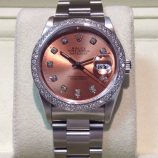 £2,699 Stock number: 10-32-266Stainless steel Datejust model 16200 on Oyster 78360 bracelet with custom-made salmon-pink / diamond dot dial and diamond-set bezel, neither of which was made by Rolex. Would suit a gentleman or a lady who likes the style of a larger watch. In lovely condition with original box-set, Datejust booklet, numbered green swing-tag and UK papers from Strang in Scotland dated December 2004. While we are not generally enthusiastic about such modified watches and accordingly put little premium onto the price of a basic model, we know many customers love them.