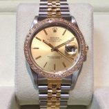 £3,199 Stock number: 12-30-017Bicolour Datejust model 16233 on Jubilee 62523 bracelet with champagne / baton dial and a diamond-set bezel which has been custom-made, NOT by Rolex. The watch shows slight signs of general wear typical for its age and we are generally not keen on such third party modifications, but we know many customers love them. Comes with our own presentation box and warranty card.