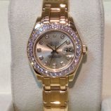 £14,399 Stock number: 10-60-15318ct yellow gold Rolex Datejust Pearlmaster model 80298 with silvery champagne / diamond dot dial on Oyster 72948 bracelet. This fantastic watch comes with the original, huge Rolex jewellery / presentation box, Datejust booklet, red swing-tag and UK papers from Strang in Scotland dated April 2004. The NEW RRP is now £33,450!
