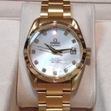 £5,999 Stock number: 12-03-02818ct yellow gold Omega Seamaster Aqua Terra co-axial chronometer bracelet watch, ref BA 468.1116 with beautiful M.O.P. / diamond dial and 12-diamond bezel! This watch could these days be worn just as easily by a gent or a lady. We had it serviced by Omega in 2009 and it has now been traded back in to us, complete with an Extract from the Archives at Omega describing the watch and confirming it was supplied to the UK in 2006. Comes with a standard Omega box-set, manual, co-axial swing-tag, our own warranty card and the Omega document from 2011. In superb order with only negligible wear to the glass, which is well reflected in this price. For a similar NEW Omega you might now expect to pay over £15,000!