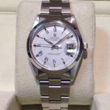 £2,099 Stock number: 12-31-010Stainless steel Oyster Perpetual DATE model 69240 from 1995, on Jubilee 62510 bracelet with white / painted roman numeral dial. In very nice order, with a later Rolex box-set, Oyster booklet, swing-tag and our own warranty card. The new equivalent is now £4,150! Available from Miltons of Church Street in Liverpool city centre.
