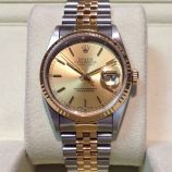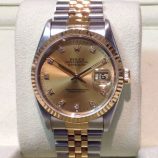 £3,499 Stock number: 12-15-005Bicolour Datejust model 16233 on Jubilee 62523 bracelet with the most popular champagne / diamond dot dial. Having had a movement service in 2014, it comes with a later Rolex box-set, an Oyster booklet, red swing-tag and our own warranty card. The NEW equivalent is now £8,600! Available from Miltons of Church Street, Liverpool city centre.