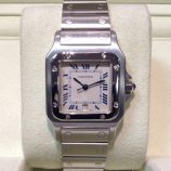 £1,099 Stock number: 12-31-017Stainless steel Cartier Santos quartz bracelet watch, case style 1564 with creamy / roman numeral dial. This watch is in generally very good condition but please note that the original crown stone has been replaced ( as often ) by a third party and there is superficial wear to the glass, all accounted for in this very keen price. Sold with our own presentation box and warranty card.