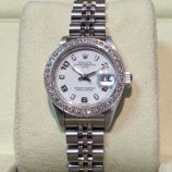 £2,299 Stock number: 10-30-215Stainless steel Oyster Perpetual DATE model 79240 with white / 2-4-6-8-10 dial and Jubilee 62510 bracelet. This watch dates from approx 2003 and has subsequently been fitted with a diamond-set bezel, which is not of Rolex manufacture, by a third party. We do not generally approve of such parts and will not offer to supply them ourselves. The watch comes with a later Rolex box, the DATE booklet, red swing-tag and our own warranty card.