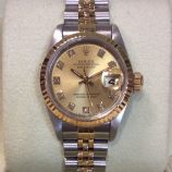 £3,399 Stock number: 30-31-185Bicolour Rolex Datejust model 69173 with champagne / diamond dot dial on Jubilee 62523 bracelet. This early 1990s watch is in very nice condition for its age, coming with a modern Oyster booklet, red swing-tag, our own presentation box and warranty card. The NEW equivalent is now £7,100!