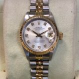 £2,699 Stock number: 12-39-008Bicolour Rolex Datejust model 69173 on Jubilee 62523 bracelet with smart silver / baton dial. Comes with original Rolex boxes, Datejust booklet, Rolex papers from the famous jeweller Bucherer dated July 1991 (though we believe the watch was manufactured a few years earlier than this) and a Rolex UK service slip from 2007. The NEW equivalent is now £5,750!