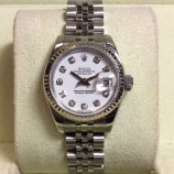 £3,899 Stock number: 12-39-012Stainless steel and white metal Rolex Datejust model 78274 with cool silver / diamond dot dial in the later style with larger settings, on Jubilee 62510 bracelet. This watch is from approximately 2002 and in fine condition, coming with Rolex boxes, Oyster booklet, red swing-tag and undated, international Rolex papers. Our pricing structure would usually like to see this version a little cheaper but it is a struggle to find any examples with diamond dials, never mind such nice ones. The NEW equivalent is now £6,300!