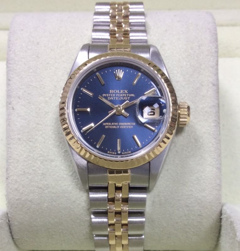 26mm bicolour Rolex Datejust, model 69173 on Jubilee 62523 bracelet with smart blue / baton dial. This watch from around 1990 is in very pleasing condition with only moderate wear to the bracelet. It comes with Rolex box, YOUR OYSTER booklet, our own warranty card and a certificate from the ALR Watch Register confirming that we checked it with them. The NEW equivalent is now £7,900! Available from Miltons of Church Street, Liverpool city centre.