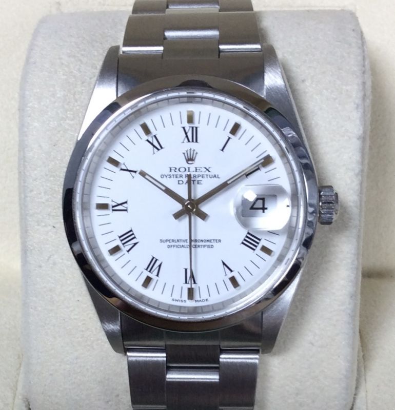 Stainless steel Rolex Oyster Perpetual DATE model 15200 on Oyster 78350 bracelet with smart white / small Roman numeral dial. In lovely condition, it comes with both boxes, YOUR ROLEX OYSTER booklet, numbered green swing-tag and UK papers from Wm. Pyke & Sons in Birkenhead dated December 2003. There is no longer a direct NEW equivalent model, but even a smaller 31mm Datejust is now £5,950! Available from Miltons of Church Street, Liverpool city centre.