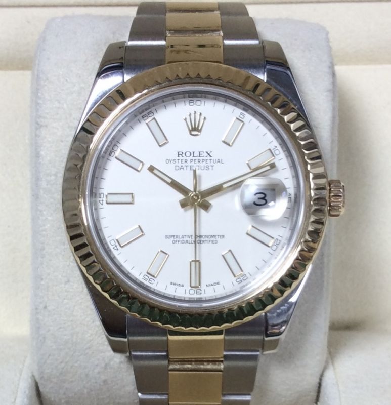 41mm steel and yellow metal Rolex Datejust II model 116333 with ivory (cream) / index baton dial on Oyster 72213 bracelet. This model first appeared around 2010 and it is in very good condition with Rolex boxes, Datejust II booklet, red chronometer swing-tag, our own warranty card and a certificate from the ALR Watch Register confirming that we checked it with them. The new equivalent is now £13,800 ! Be warned: this is a massive watch. Available from Miltons of Chester, under the famous clock.