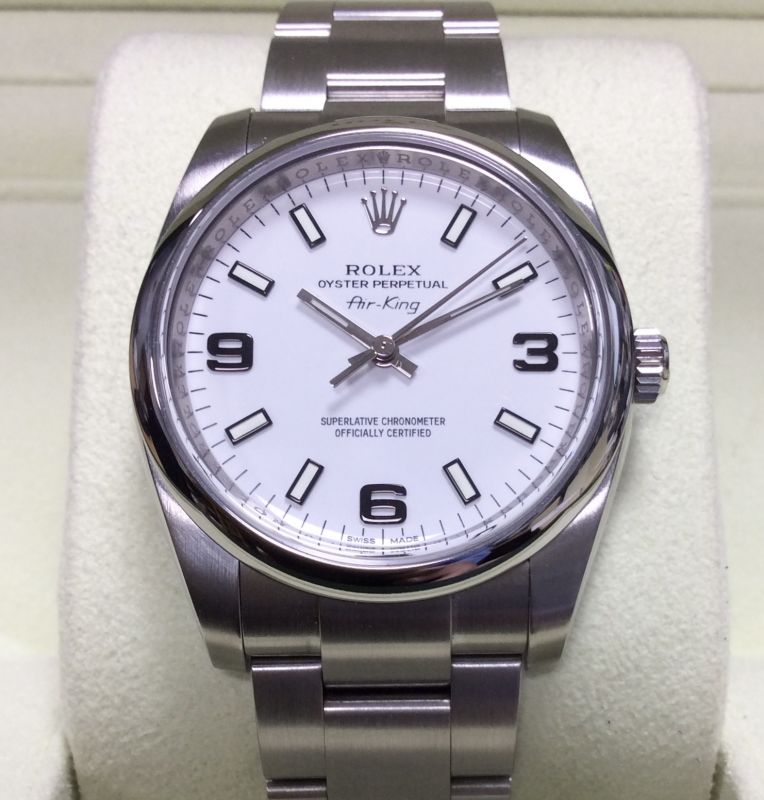 Smart dial option, no longer offered ! 34mm stainless steel Rolex Oyster Perpetual Air-King (non-date) model 114200 with bright white / index baton / 3-6-9 dial on Oyster 70190 bracelet. In superb condition, it comes with both boxes, Oyster Perpetual booklet, numbered green swing-tag and UK warranty card from David M. Robinson in Liverpool dated November 2013. A NEW Air-King now costs £6,250 but in truth a closer new equivalent may be the plain Oyster Perpetual 34 model 124200 at £4,850. Supply is still not meeting demand and residual prices of such watches remain very strong.