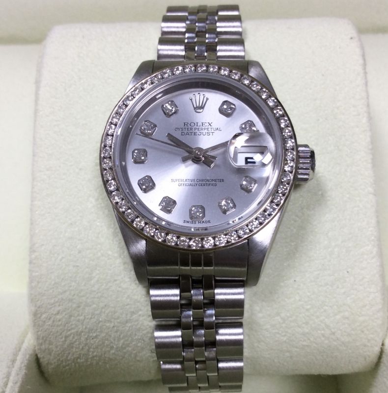 Lady’s 26mm stainless steel Rolex Datejust model 69174 on Jubilee 62510 bracelet with silver / diamond dot dial and diamond bezel which have been custom-made, NOT by Rolex. Please note that while this style of channel-set bezel creates a sparkling piece, stones may be lost if it suffers hard wear or a sharp knock — so we advise that it is used for dress wear only. As loyal devotees to the Rolex brand we are not great fans of customised pieces and will not supply such parts on customer request, but when our pawnbroking departments are left with one already fitted like this there always seems to be a queue of buyers! This 1997 model is in very pleasing condition but under close examination we do not some minor signs of age / wear to the dial and bracelet. Comes with later Rolex box, YOUR ROLEX OYSTER booklet, our own warranty card and a certificate from the ALR Watch Register confirming that we checked it with them.