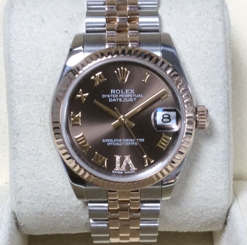 31mm / mid-size steel and rose metal Rolex Datejust model 178271 on Jubilee 63161 bracelet. The original “chocolate” / roman numeral dial with diamond detail in the “VI” beautifully complements the warm colour of the rose metal. Has Rolex boxes, Datejust booklet, green swing-tag and international Rolex warranty card dated September 2016. The NEW equivalent is now £11,650 ! Available from Miltons of Church Street, Liverpool city centre.