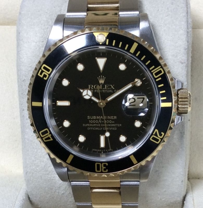Outstanding example ! Bicolour Rolex Date Submariner model 16613 with black dial and bezel insert on Oyster Fliplock 93153 bracelet. Comes with Rolex boxes, Submariner booklet and UK papers from John Bull & Co in Bedford dated June 1994. This is an exceptional example showing very little wear and even retaining the delivery sticker on its case-back. The NEW equivalent is now £14,200 ! Available from Miltons of Chester, under the famous clock.