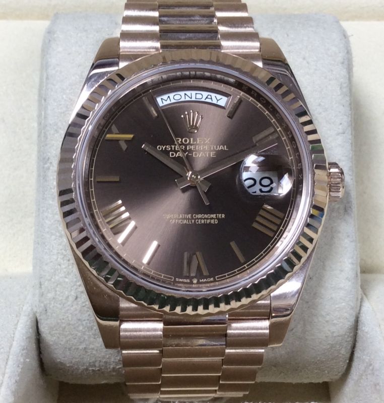 Outstanding gold Day-Date with desirable CHOCOLATE DIAL ! 18ct rose gold Rolex Day-Date 40 model 228235 on President 83415 bracelet with chocolate / roman numeral dial. Launched around the 60th anniversary of the very first Day-Date, it remains a current and very popular model. Having just had a new glass fitted through a Rolex main agent it is in beautiful condition after spending much of its short life in our pawnbroking safes, coming with large Rolex boxes, Day-Date booklet, green swing-tag and international Rolex warranty card dated March 2021. The NEW RRP is now £37,800 ! The bracelet is currently somewhat short, but we hope to have additional links arriving shortly.