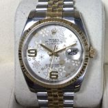 26mm bicolour Rolex Datejust model 79173 with unusual cream Jubilee / Arabic numeral dial on Oyster 78243 bracelet. In very good condition with only moderate wear to the bracelet, it comes with both boxes, Datejust booklet, numbered green swing-tag and UK papers from David M. Robinson dated November 2001. The NEW equivalent is now £9,450 ! Available from Miltons of 36 Borough Pavement, Birkenhead Pyramids. RRP1025