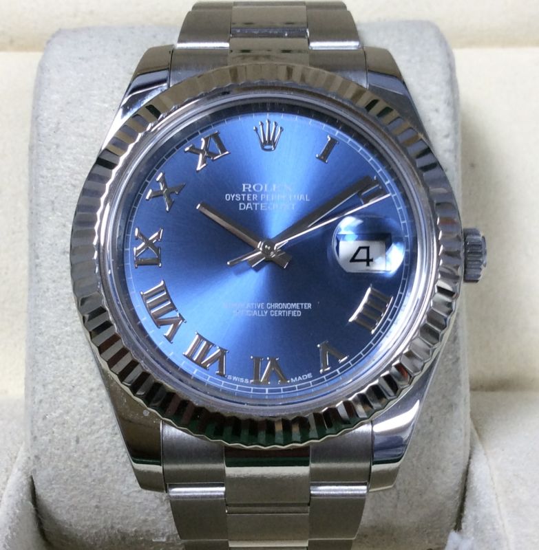 41mm stainless steel and white metal Rolex Datejust II model 116334 with gorgeous Azzuro blue / Roman numeral dial on Oyster 72210A bracelet. In excellent condition, it comes with both boxes, Datejust booklet, green chronometer swing-tag and UK warranty card from Aurum Group (Goldsmiths etc) dated October 2016. The NEW equivalent is now £9,100 but availability can be poor. Be warned: these are BIG watches ! Available from Miltons of Church Street, Liverpool city centre.