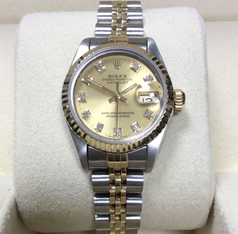 26mm bicolour Rolex Datejust model 69173 with sparkling champagne / diamond dot dial on Jubilee 62523 bracelet. Comes with Rolex boxes, YOUR ROLEX OYSTER booklet and Rolex papers from Valencia dated March 1994. In good condition but the price reflects some wear / distortion to the bracelet. The NEW equivalent is now £11,250 !