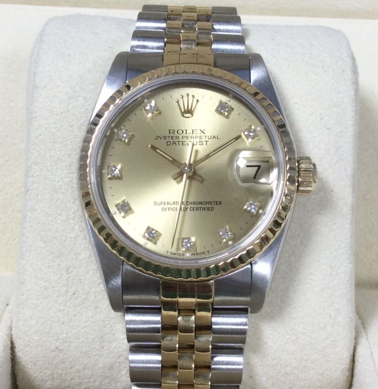 31mm / mid-size bicolour Rolex Datejust model 68273 on Jubilee 62523 bracelet with sparkling champagne / diamond dot dial. This early 1990s watch is in very good condition. Comes with a later Rolex box, Datejust booklet, our own warranty card and a certificate from the ALR Watch Register confirming that we checked it with them. The NEW equivalent is now £12,000 !