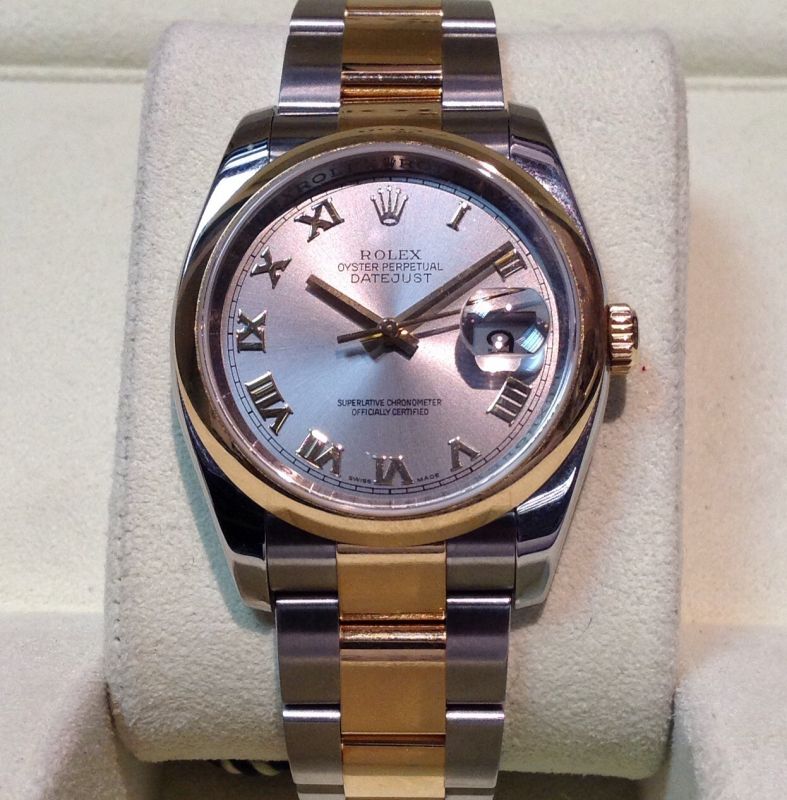 Bicolour Datejust model 116203 on Oyster 72203 bracelet with silver / roman numeral dial. In excellent condition with Rolex boxes, Datejust booklet, red swing-tag and Rolex warranty card dated October 2008. The NEW equivalent is now £6,850! Available from Miltons of Chester, under the famous clock.