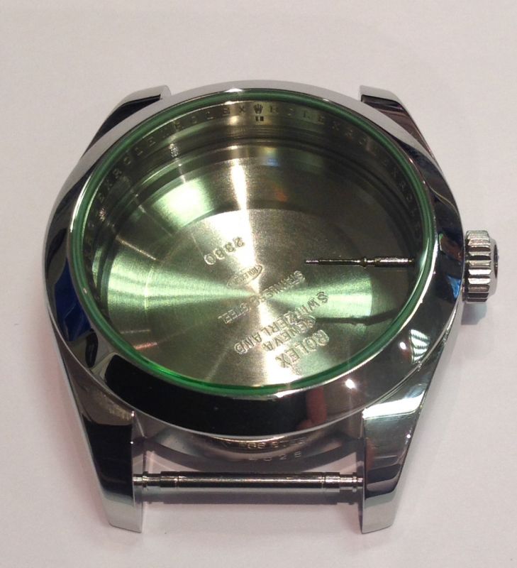 The anti-magnetic Rolex Milgauss was re-introduced a few years ago in three variants. This is the 116400 GV which features a unique green synthetic sapphire crystal. One normally sees it with the dark dial underneath but we thought clients of Miltons might like to see what the glass looks like without such background interference.