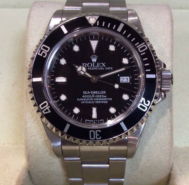 Fresh from Rolex service! Stainless steel Rolex Sea-Dweller 4000 model 16600 with black dial and bezel insert on Oyster Fliplock 93160 bracelet. This 1997 model has just returned from having a £579 service, new glass and crown at Rolex UK. Still bearing its service stickers, it comes with Rolex boxes, later Submariner / Sea-Dweller booklet, red swing-tag, Rolex UK service card dated May 2015 and our own warranty card. It is in excellent condition now, though purists may like to note that we think the clasp extension link has been replaced at some point. The NEW equivalent is now £6,900!
