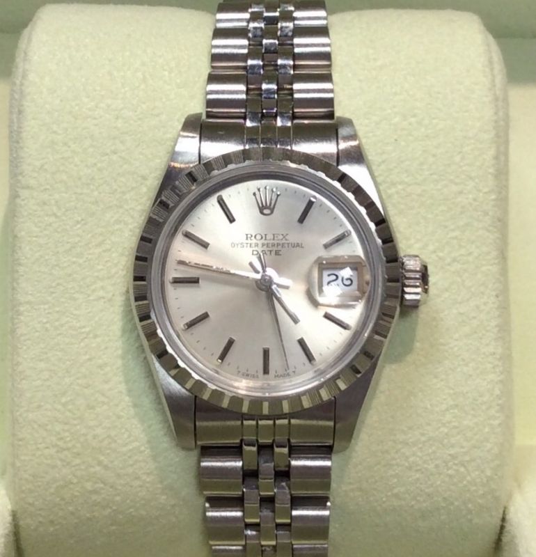 Stainless steel Rolex Oyster Perpetual DATE model 69240 from the late 1980s, on Jubilee 62510 bracelet with smart silver / baton dial. In very nice condition with Rolex box-set and our own warranty card, but we do note some superficial marks to the hands and wear to the bracelet. The new equivalent is now £4,550!