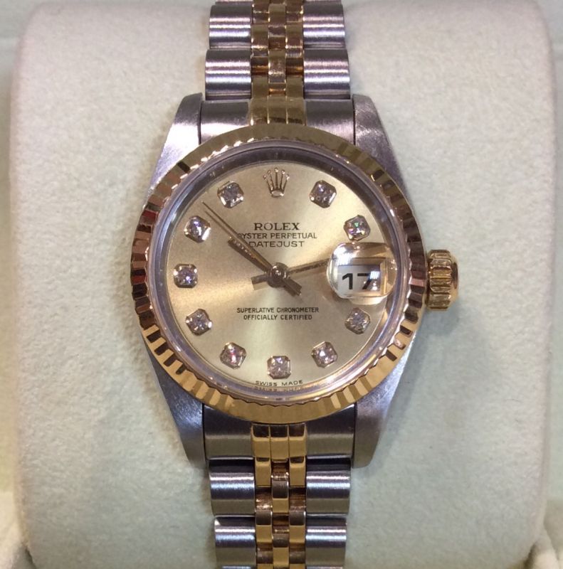 26mm bicolour Rolex Datejust model 79173 with classic champagne / diamond dot dial in the later style, on Jubilee 62523 bracelet. In excellent condition with Rolex boxes, Datejust booklet and UK papers from E.P.Mallory & Son in Bath dated March 2002. The NEW equivalent is now £9,250!