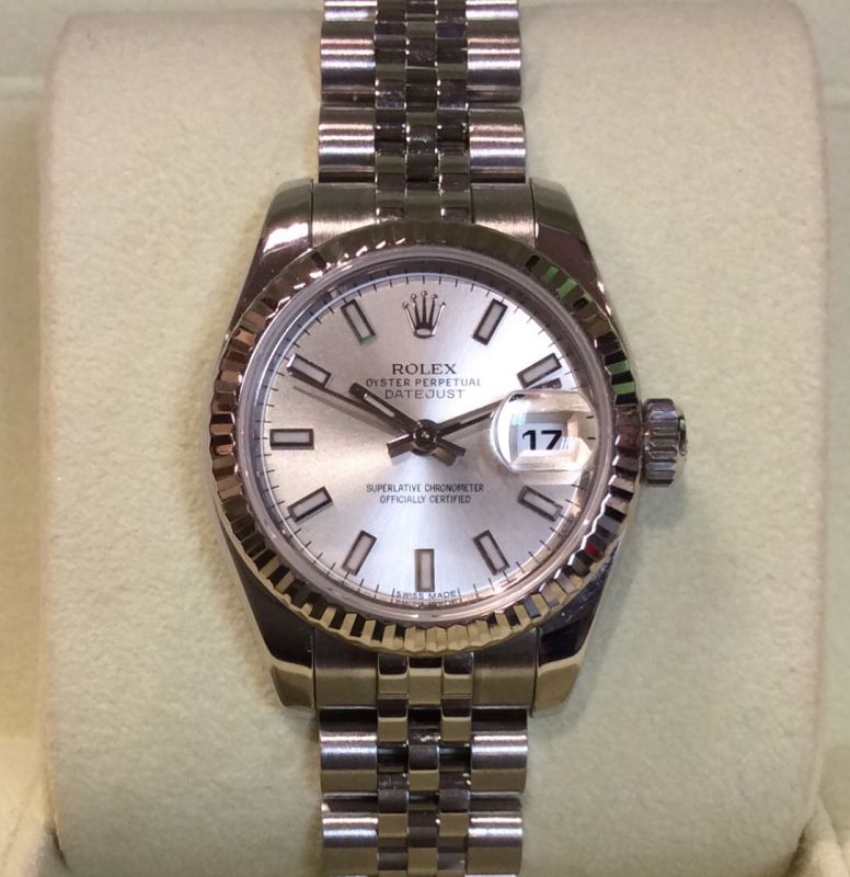 Stainless steel and white metal Rolex Datejust model 179174 with attractive silver / baton dial on Jubilee 63130 bracelet. This random case-number watch is in superb condition and comes with Rolex boxes, Datejust booklet, red swing-tag and our own warranty card. The NEW RRP is now £4,800!