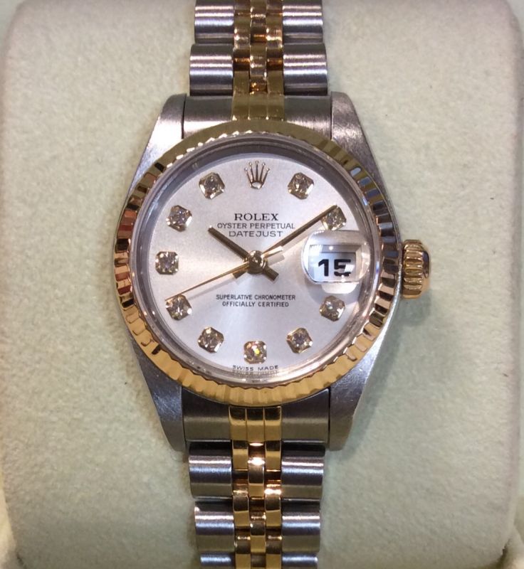 Bicolour Rolex Datejust model 79173 with pretty silver / diamond dot dial in the newer style, on Jubilee 62523 bracelet. In fine condition with Rolex boxes, Datejust booklet, numbered green swing-tag and UK papers from David M. Robinson dated June 2003. The NEW equivalent is now £7,100!