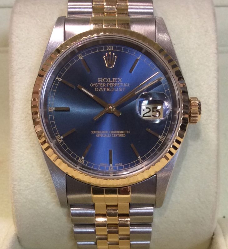 Bicolour Rolex Datejust model 16233 on Jubilee 62523 bracelet with lovely dark BLUE / baton dial. This 2001 model is in super condition with Rolex boxes, a Datejust booklet and our own warranty card. The NEW equivalent is now £7,250 !