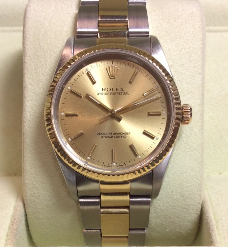 Bicolour Rolex Oyster Perpetual NON-date model 14233 with champagne / baton dial on Oyster 78353 bracelet. Comes with its original Rolex papers from Nassau in the Bahamas dated September 1999, the Oyster booklet and later Rolex boxes. The bracelet shows significant wear such as one might expect of an older piece and from its markings does indeed appear to have come from an older watch; perhaps the original was damaged in some way and this one used to replace it. The watch still has a lot of life remaining if kept for lighter, “dress” wear and is priced very keenly for a two-tone model.