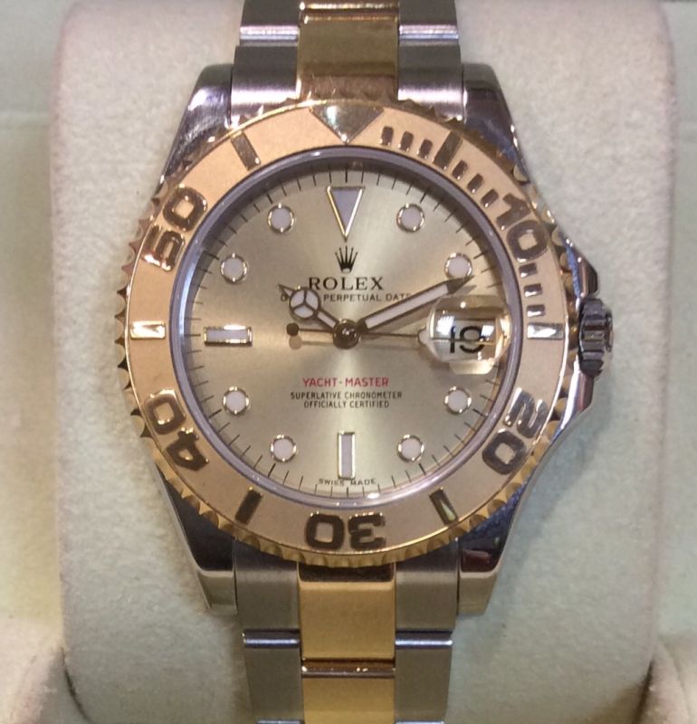Mid-size bicolour Rolex Yachtmaster model 168623 with champagne dial on Oysterlock 78753 bracelet. Has Rolex boxes, Yachtmaster booklet and UK papers from Mappin & Webb Group in Manchester dated December 2010. We note from the case number, however, that this watch was made in 2003.  Its fantastic condition may indicate that it was indeed sold more recently than that, as the papers suggest. The NEW RRP is now £7,550!
