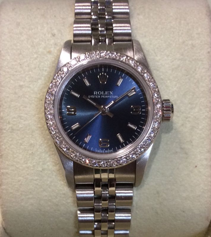 Stainless steel Rolex Oyster Perpetual non-date model 76094 with blue / 3-6-9 dial on Jubilee 62510 bracelet. This 2002 model has been fitted with a diamond-set bezel that is NOT by Rolex. As loyal followers of the Rolex brand we are not great fans of customised pieces and will not supply such parts on customer request, but whenever our pawnbroking departments are left with one already fitted like this there always seems to be a queue of buyers! Comes with an Oyster booklet, our own presentation box and warranty card.