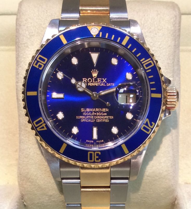 Bicolour Rolex Date Submariner model 16613 with blue dial and bezel insert on Oyster Fliplock 93253 bracelet. This 2002 model is fitted with the revised, heavier bracelet with solid end links and yellow metal running through the clasp. The bezel insert has just been replaced with a new, genuine one from Rolex. It is in excellent condition with Rolex boxes, Submariner booklet, red swing-tag and our own warranty card. The NEW equivalent is now £8,950!