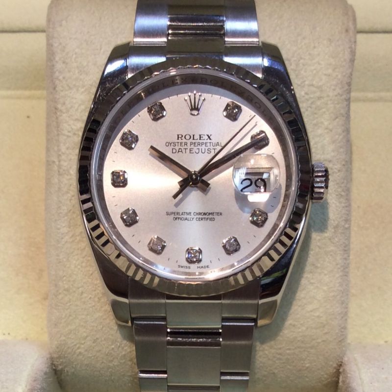 Stainless steel and white metal Rolex Datejust model 116234 with smart silver / diamond dot dial on Oyster 72200 bracelet, in excellent condition with negligible wear to the glass. Comes with Rolex boxes, Datejust booklet, numbered green swing-tag and UK warranty card from David M. Robinson dated December 2008. The NEW equivalent is now £6,600!