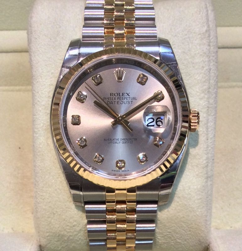 UNWORN, in delivery stickers! Bicolour Rolex Datejust model 116233 with smart “steel” (grey) / diamond dot dial on Jubilee 63603 bracelet. Comes with Rolex boxes, Datejust booklet, both green swing-tags and international Rolex warranty card dated March 2016. The NEW RRP is now £8,600!